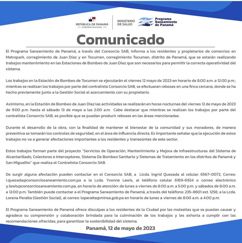 Asimismo, en la Estación de Bombeo de Juan Díaz las actividades se realizarán en horas nocturnas del viernes 12 de mayo de 2023 de 9:00 p.m. hasta el sábado 13 de mayo a las 2:00 a.m. Cabe destacar que mientras se realizan los trabajos por parte del contratista Consorcio SAB, es posible que se puedan producir reboses en las áreas mencionadas.