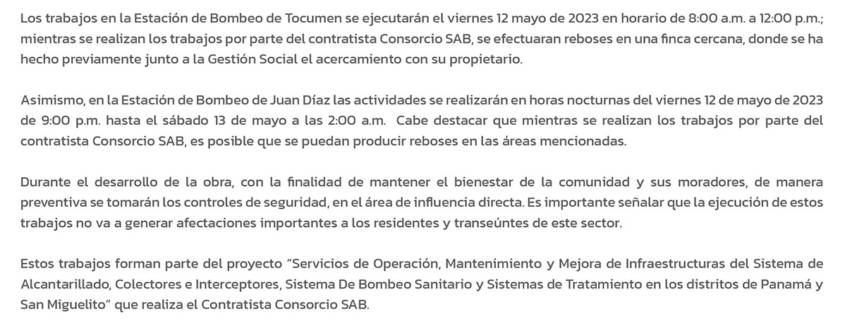 Los trabajos en la Estación de Bombeo de Tocumen se ejecutarán el viernes 12 mayo de 2023 en horario de 8:00 a.m. a 12:00 p.m.; mientras se realizan los trabajos por parte del contratista Consorcio SAB, se efectuaran reboses en una finca cercana, donde se ha hecho previamente junto a la Gestión Social el acercamiento con su propietario.